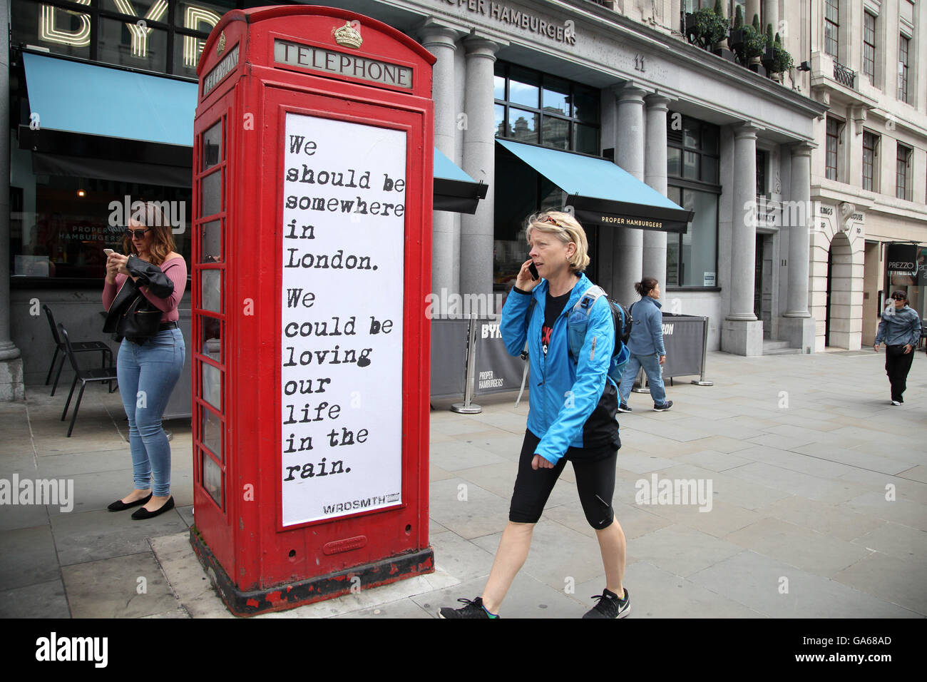 A Woman On A Mobile Phone Pass By A Quote On A Red Telephone Box On Stock Photo Alamy