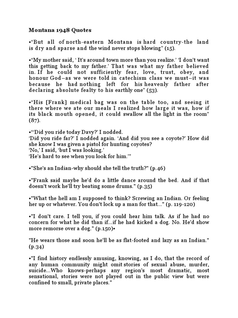 Montana 1948 Summary Study Guide includes detailed chapter summaries and analysis quotes character descriptions themes and more. All page numbers and citation info for the quotes. The Montana 1948 quotes below are all either spoken by Frank Hayden or refer to Frank Hayden.